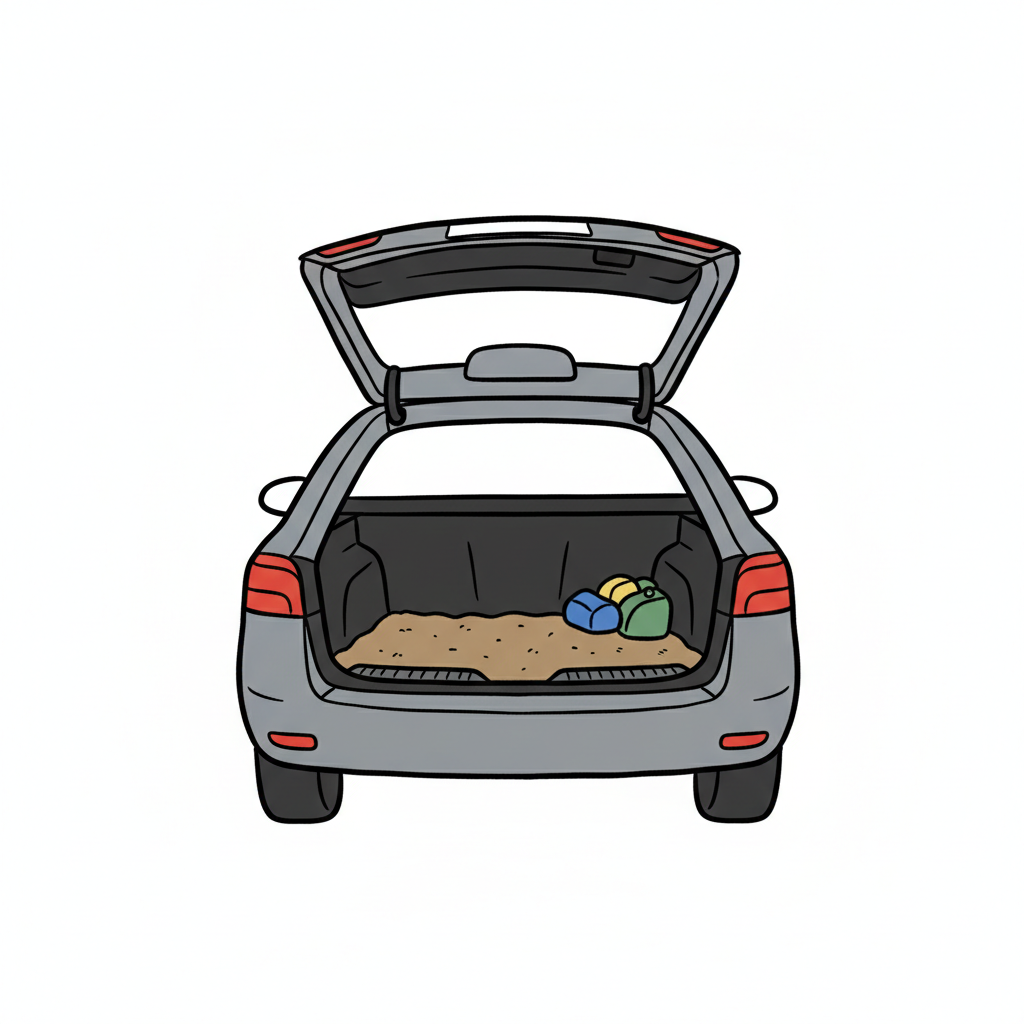 Graues Auto mit offenem Kofferraum, gefüllt mit Sand und Strandspielzeug.