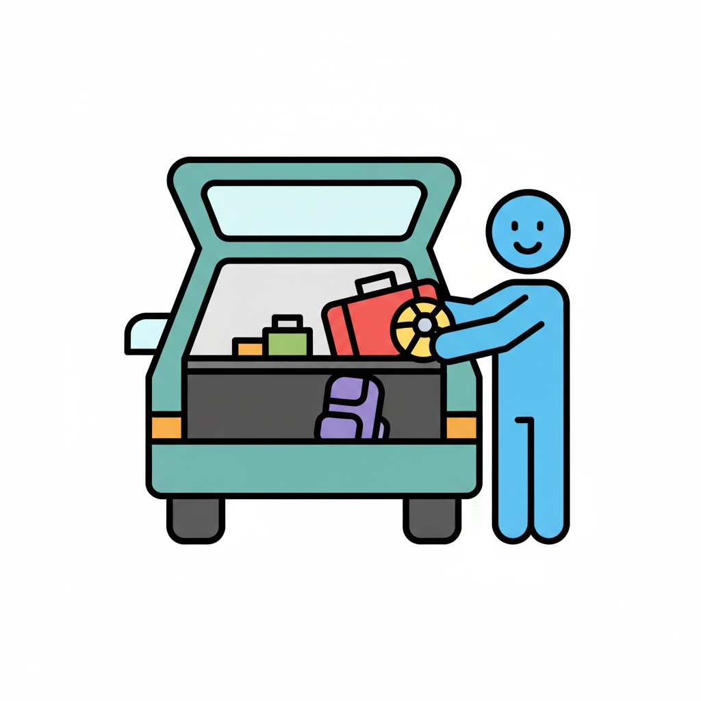 Ein lächelnder Strichmännchen lädt Gepäck in den offenen Kofferraum eines Autos.