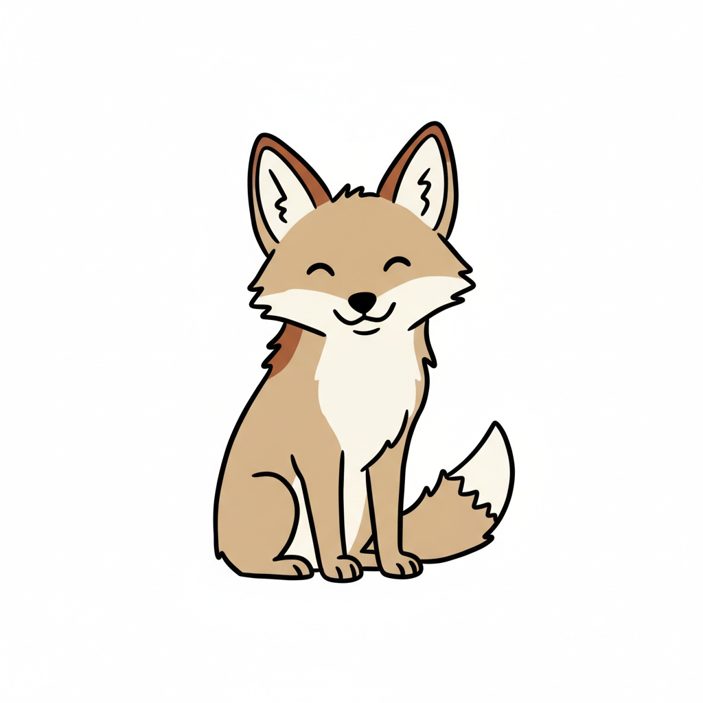 Ein lächelnder, cartoonartiger Fuchs sitzt fröhlich da.