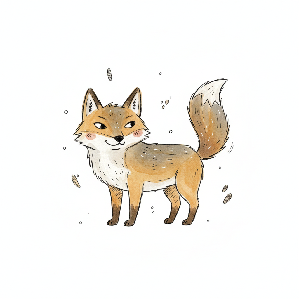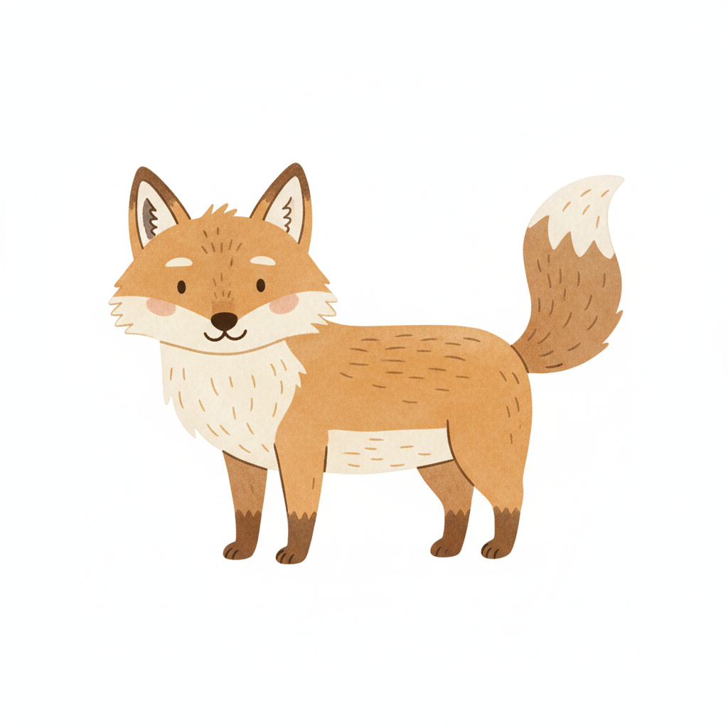 Ein fröhlicher, cartoonartiger Fuchs mit einem verspielten Ausdruck.