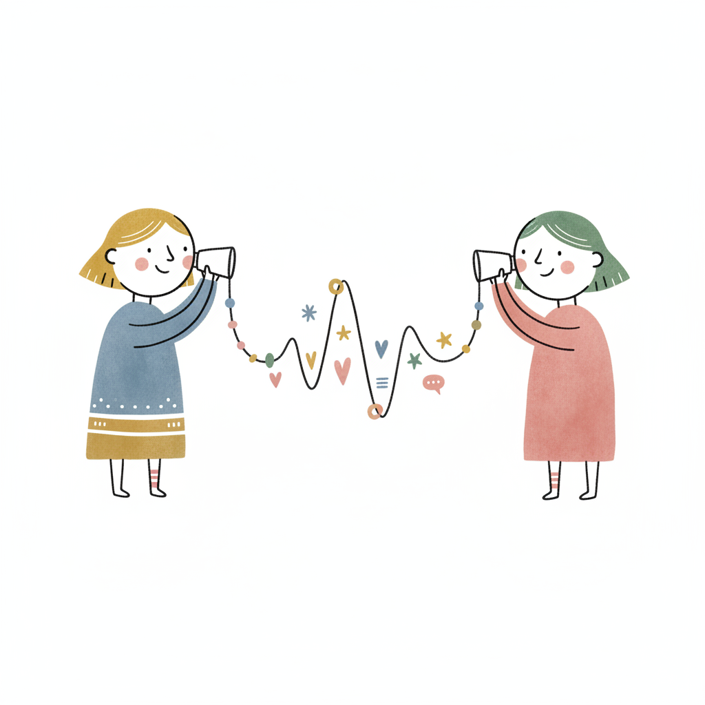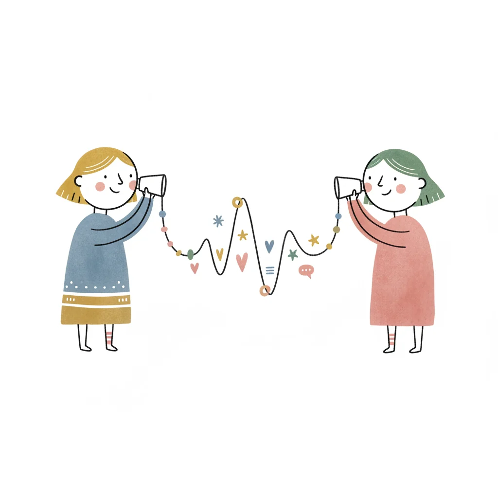 Zwei Mädchen kommunizieren mit Dosentelefonen, verbunden durch eine bunte Linie mit Symbolen.