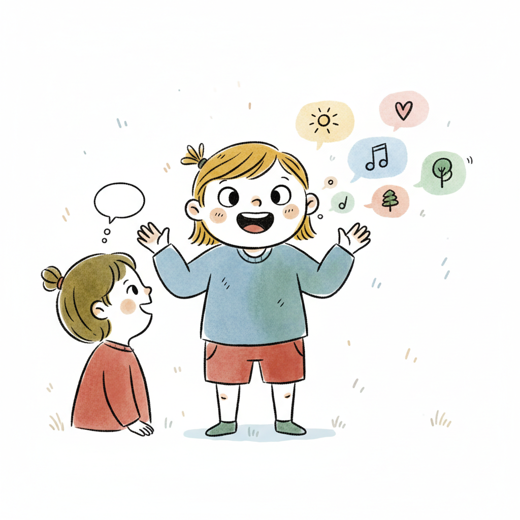 Ein Kind erzählt lebhaft mit Symbolen (Sonne, Herz, Musik, Baum), ein anderes hört zu.