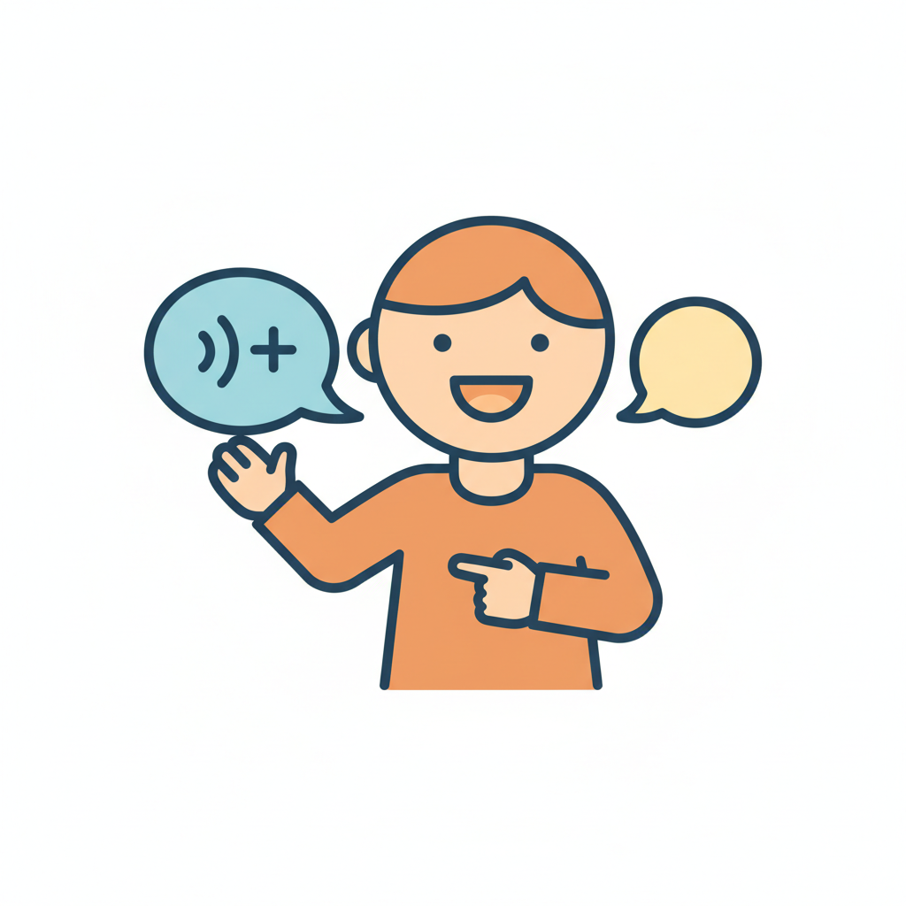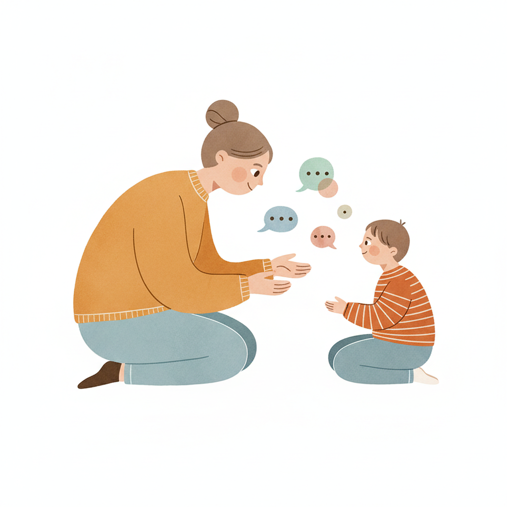 Illustration einer Frau und eines Kindes im Gespräch, umgeben von Sprechblasen.