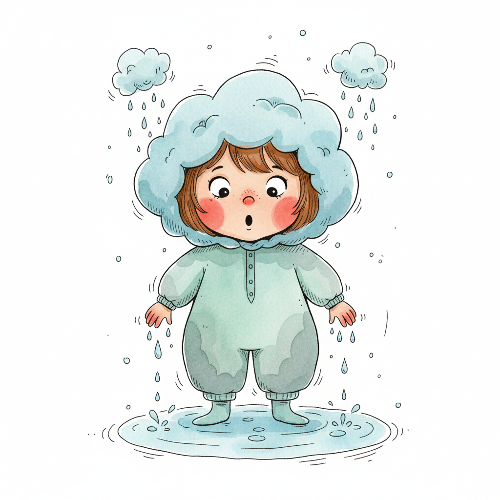 Niedliche, kindgerecht illustrierte Szene mit einem Kind oder einer Person als Hauptfigur, vor rein weißem Hintergrund, im frech-nordischen Aquarell-Skizzenstil. Klare, leicht wackelige Tuschekonturen, sichtbare Pinsel- und Strichtextur, dezente Schraffuren, weiche handgemalte Farbflächen in gedeckten Farben. Einfache, runde Formen. Keine harten Schatten, sondern sanfte, transparente Aquarellschichten. Leicht raue, handgezeichnete Linien statt glatter Vektorkanten. Subtile, vereinzelte Kritzelpunkte oder kleine Details im Hintergrund (wie Pünktchen oder feine Striche), aber keine echte Umgebung oder Landschaft. Die Figur ist mittig zentriert. Insgesamt charmant, humorvoll, warm und handgemacht wirkend. WICHTIG: Das Bild darf ABSOLUT KEINEN TEXT, KEINE BUCHSTABEN und KEINE ZAHLEN enthalten.
