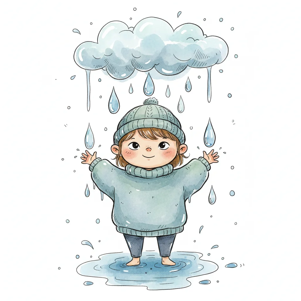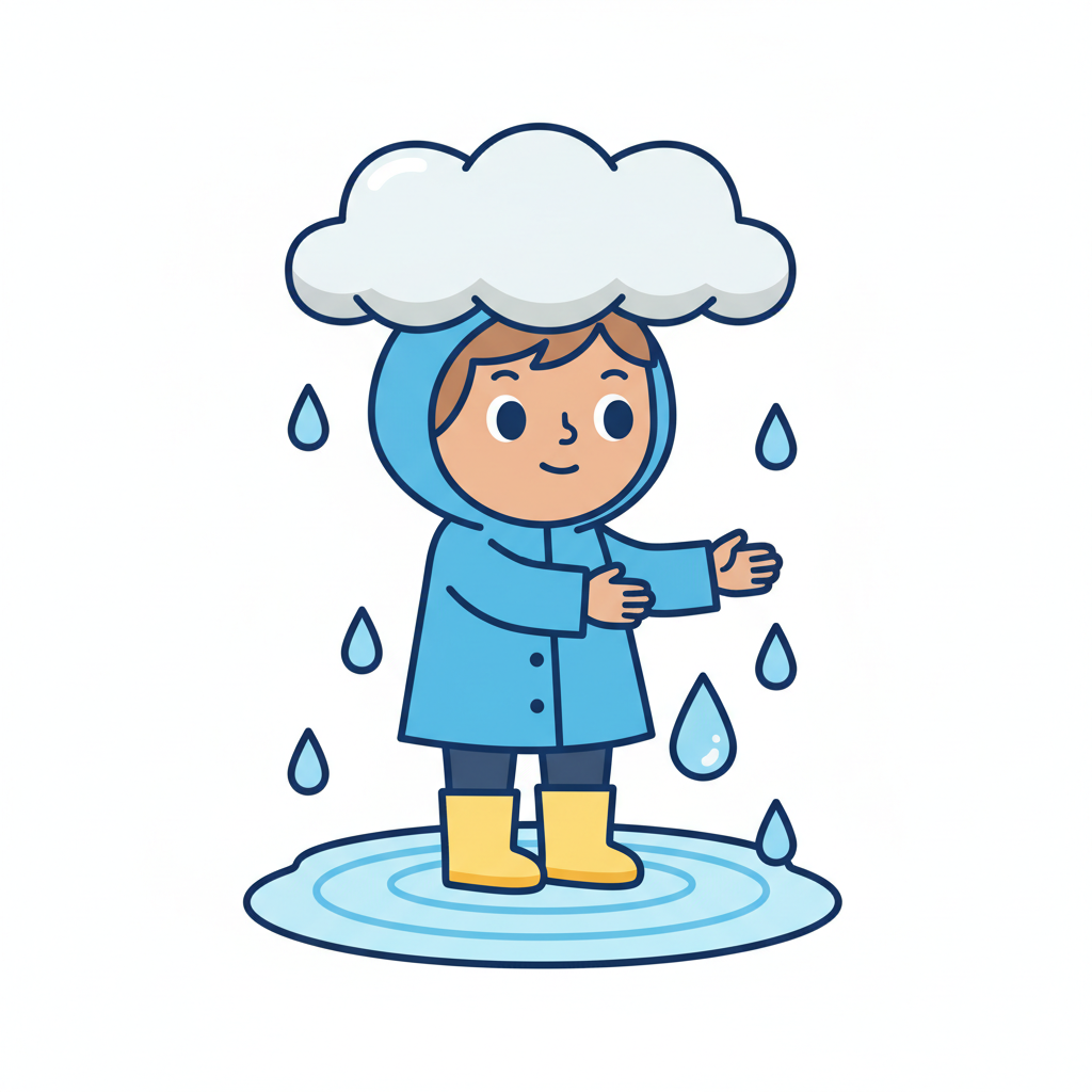 Fröhliches Strichmännchen-Kind fängt Regenwasser in den Händen, Wolke regnet.