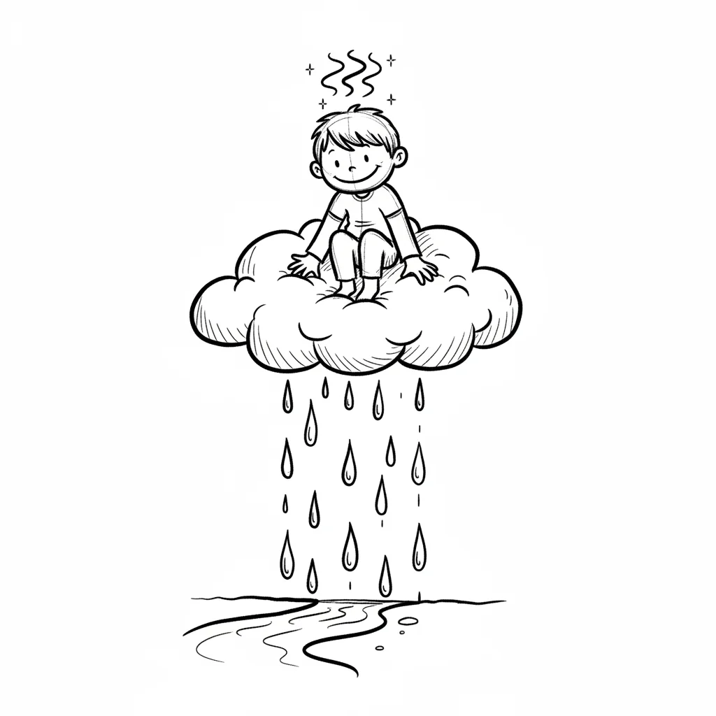Ein lächelnder Junge sitzt auf einer Regenwolke, die den Boden bewässert und einen Bach bildet.