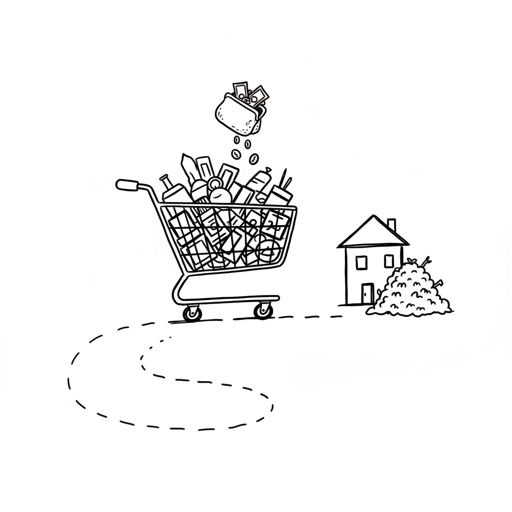 Einkaufswagen voller Waren, Geld fällt aus Geldbörse, Haus mit Müllberg. Konsum und Abfallkreislauf.