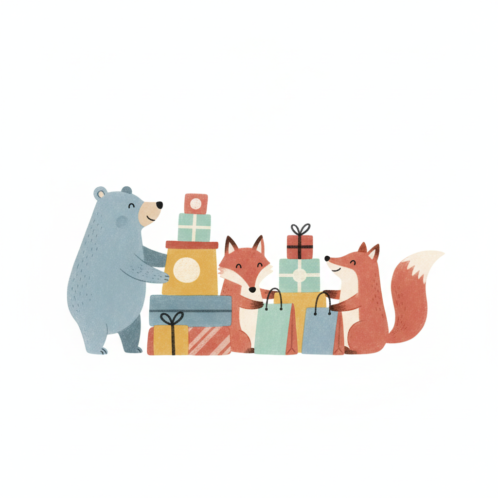 Fröhliche Illustration: Ein Bär und zwei Füchse umgeben von Geschenken und Einkaufstaschen.