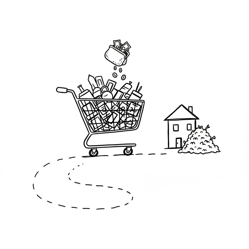 Einkaufswagen voller Güter, umgeben von Symbolen für Konsum, Finanzen und Lifestyle.