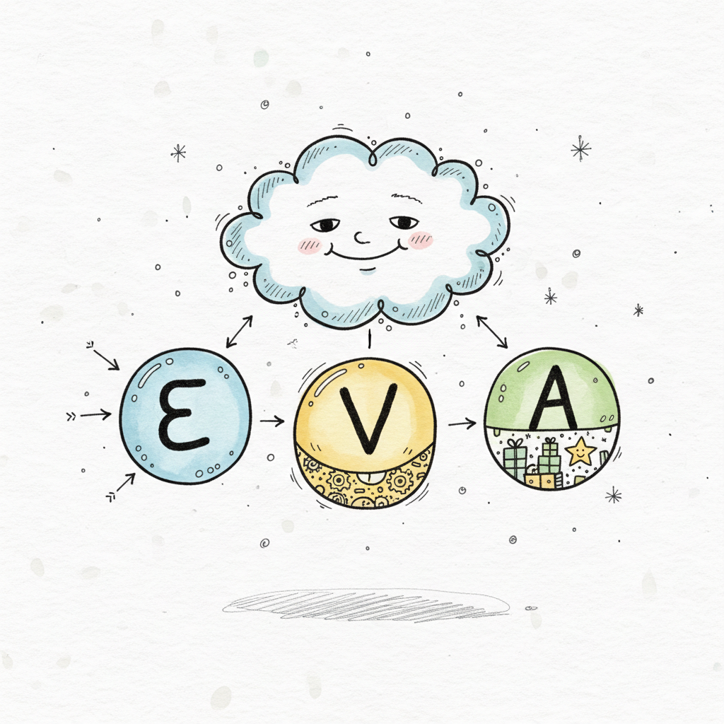 Niedliche Wolke interagiert mit E, V, A-Kreisen, die Input, Zahnräder und Geschenke zeigen.