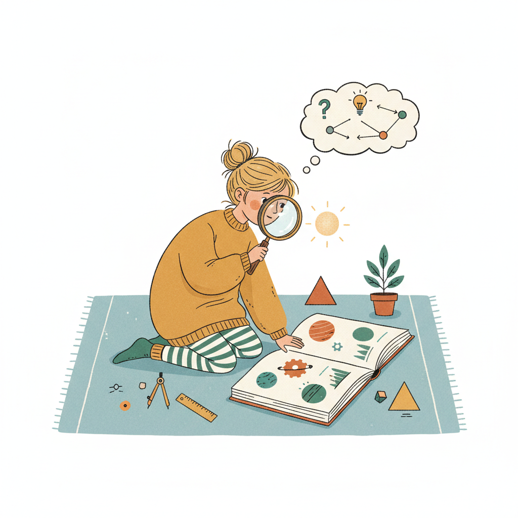 Kinder erforschen spielerisch das Alphabet und wissenschaftliche Konzepte mit Lupe und Notizblock.