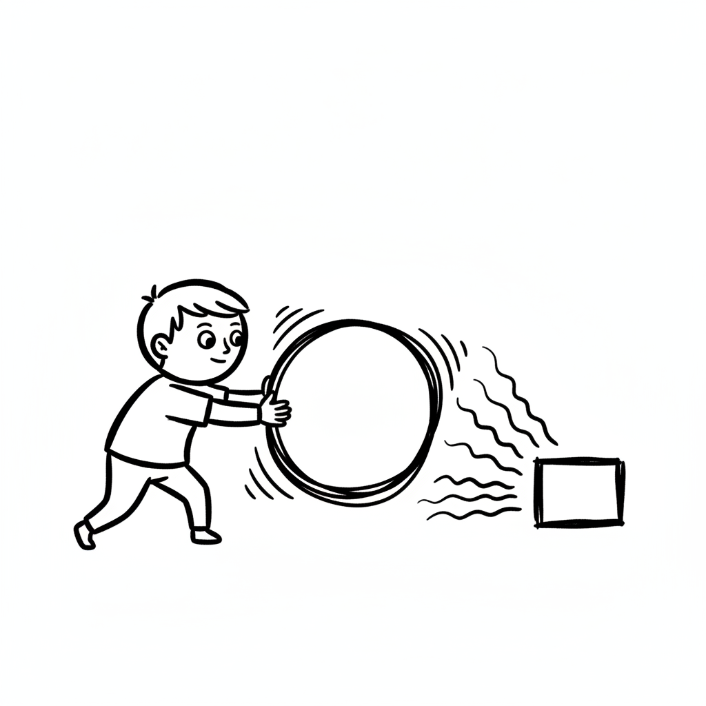 Cartoonjunge schiebt einen Kreis, der Wellen zu einem Quadrat sendet.