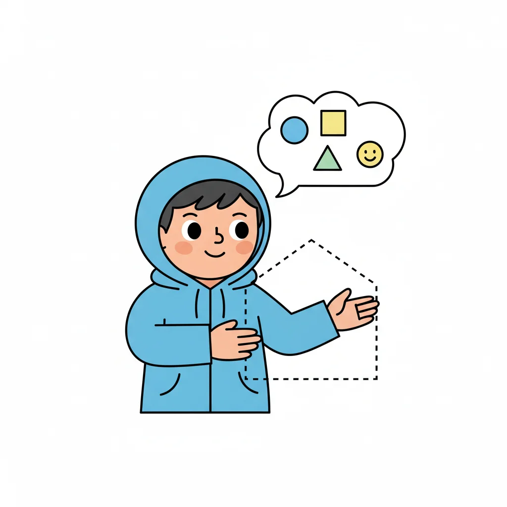 Cartoonfigur in blauem Hoodie erklärt Formen und ein Hauskonzept mit Gesten.