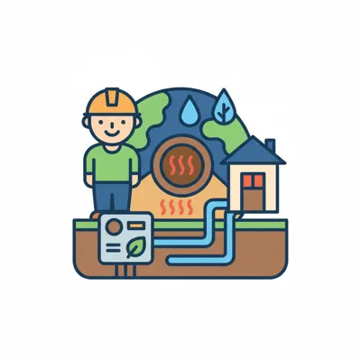 Geothermie-Konzept: Erdwärme wird zur Beheizung eines Hauses genutzt, überwacht von einem Arbeiter.