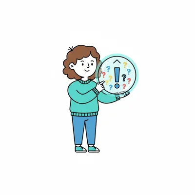 Cartoonfigur präsentiert eine Blase mit einem Ausrufezeichen und vielen Fragezeichen.