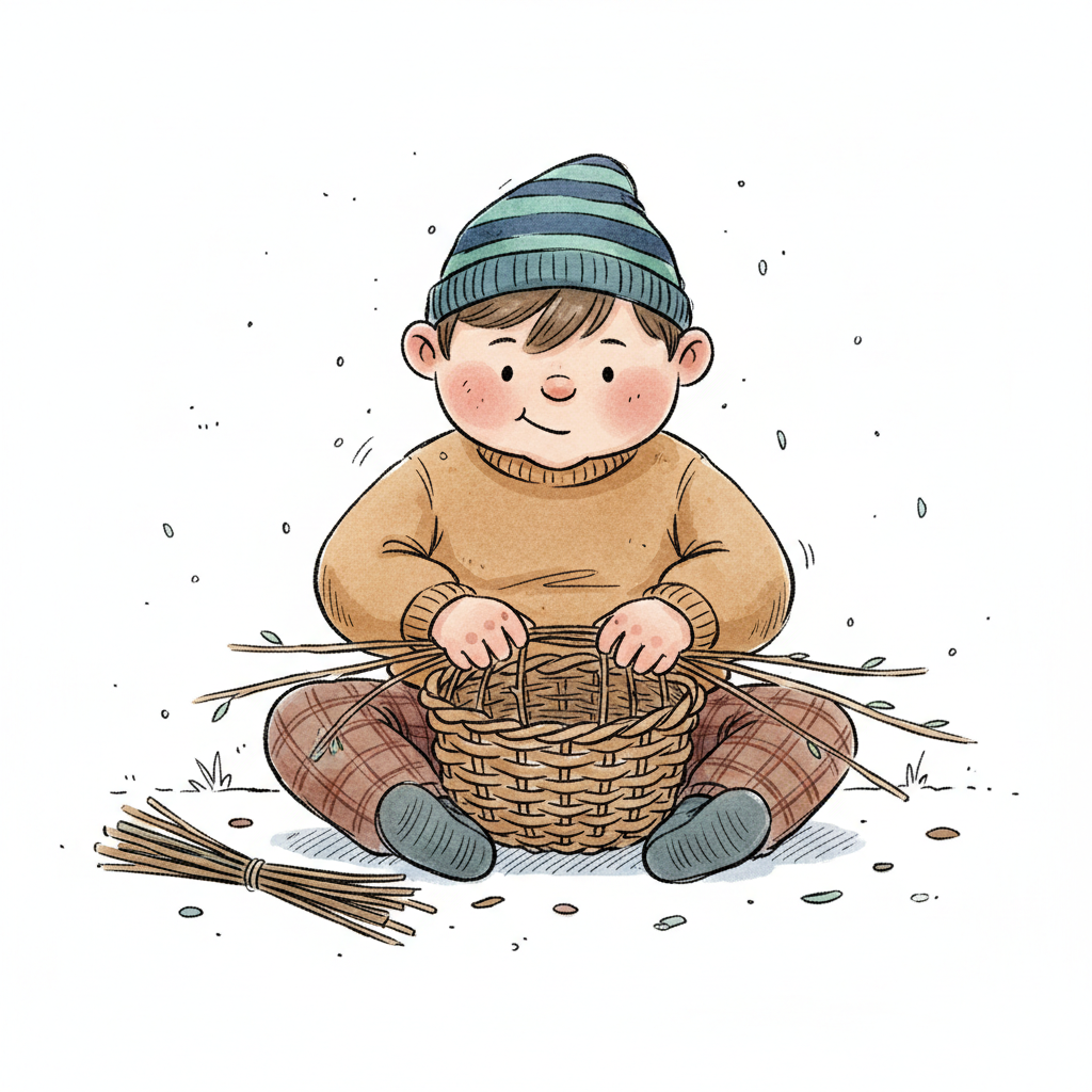 Illustration eines Jungen, der sitzend einen Korb aus Weiden flechtet.