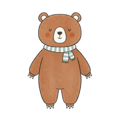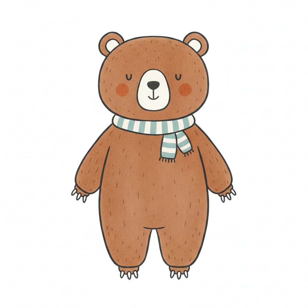 Ein niedlicher Bär mit Schal, freundlich und cartoonhaft gezeichnet.