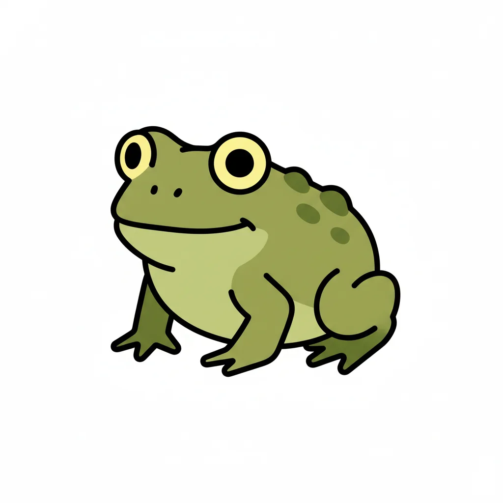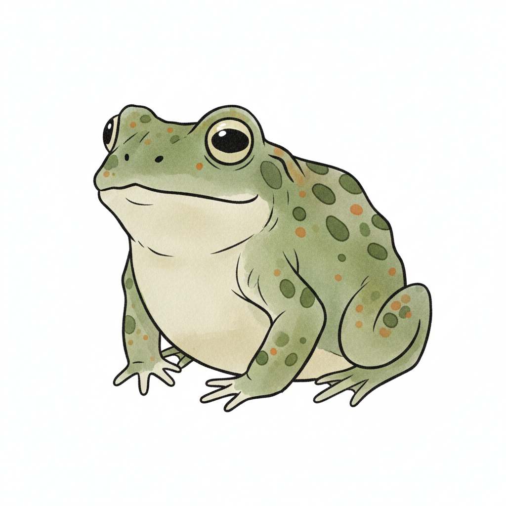 Eine grüne Froschillustration mit braunen Punkten und freundlichem Gesichtsausdruck.