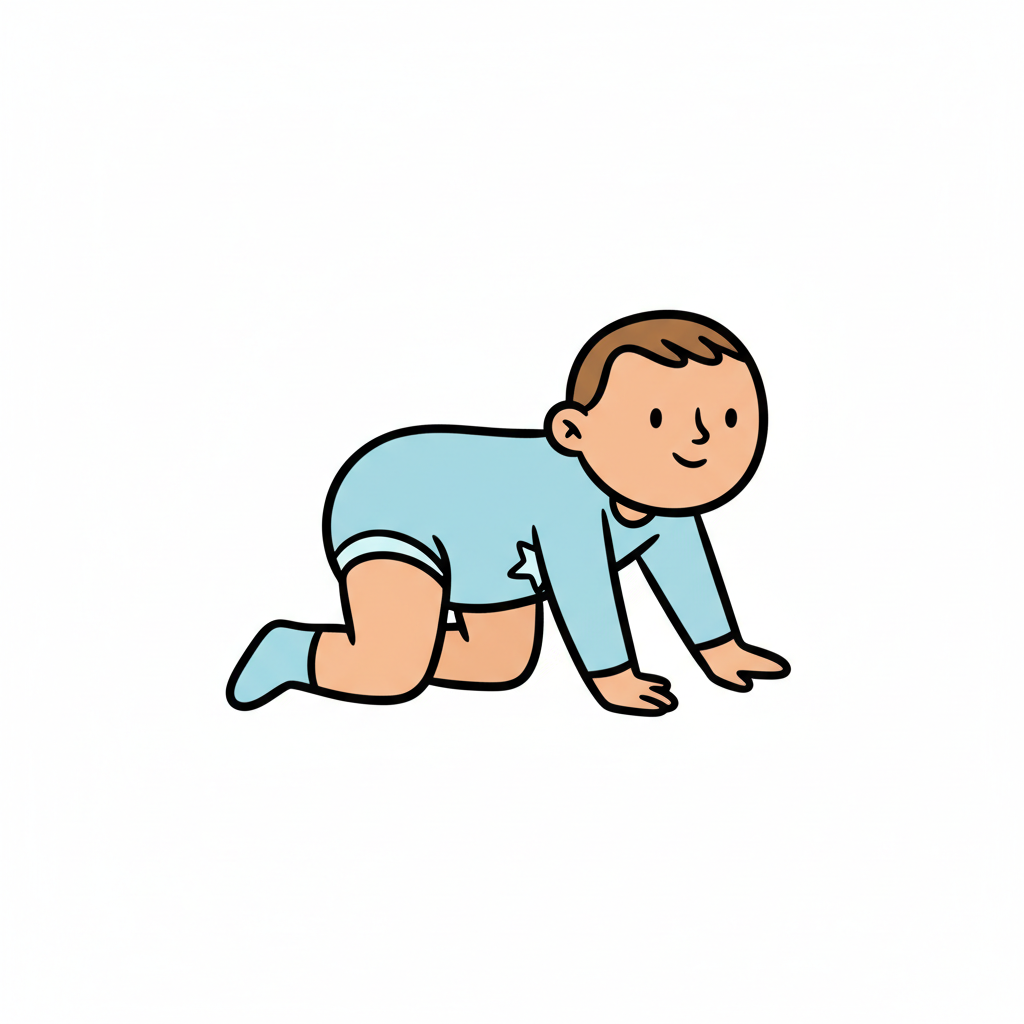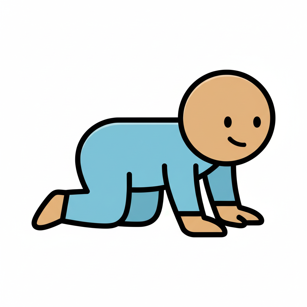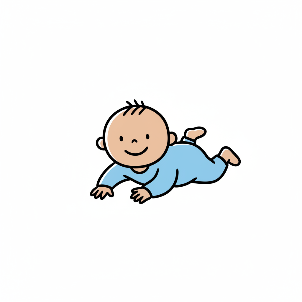 Ein lächelndes Baby in blauer Kleidung, das auf dem Bauch liegend krabbelt.