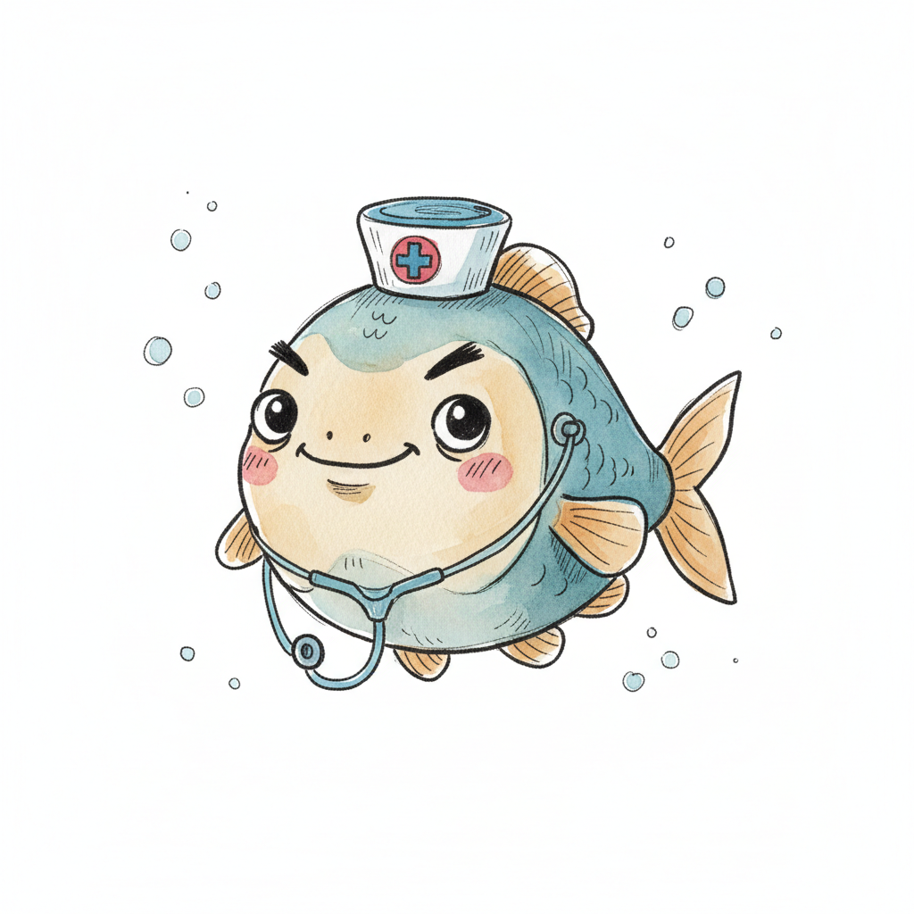 Ein lächelnder Fisch als niedlicher Krankenpfleger mit Stethoskop.