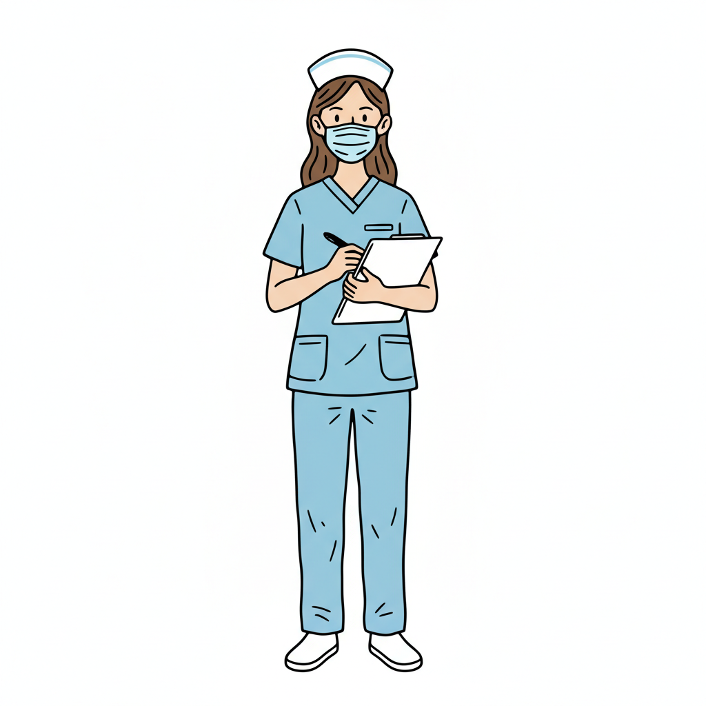 Eine Krankenschwester mit Notizblock in blauer Uniform und Mundschutz.