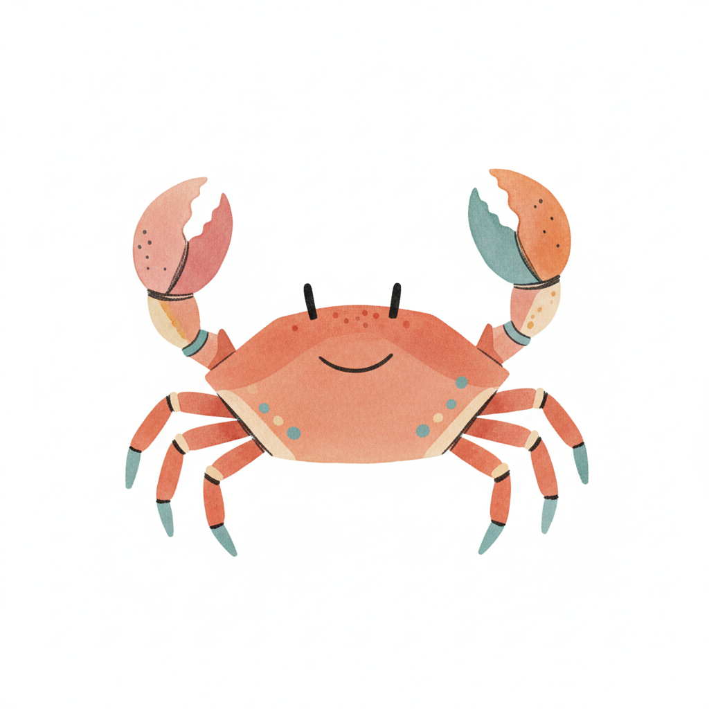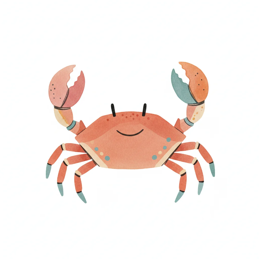 Ein lächelnder Krebs mit bunten Scheren auf weißem Hintergrund.