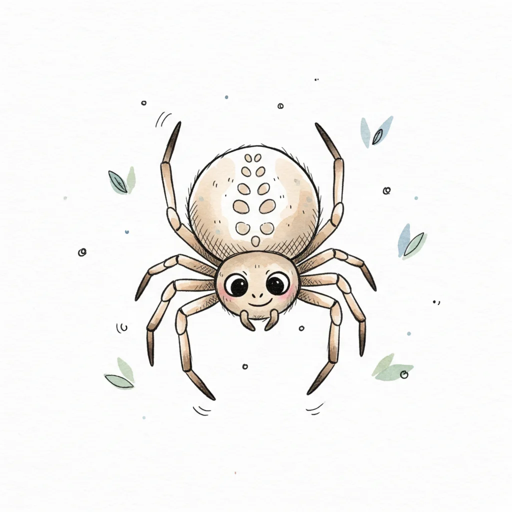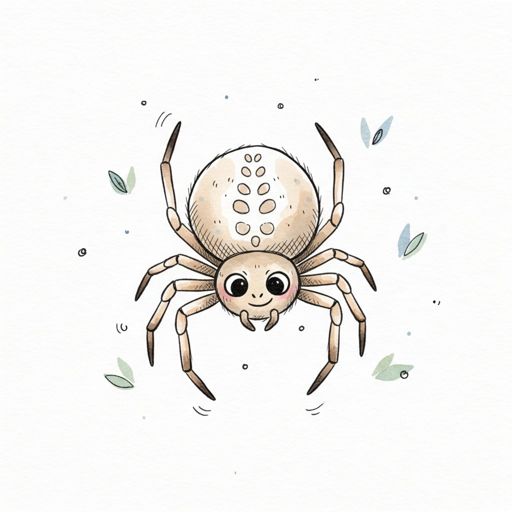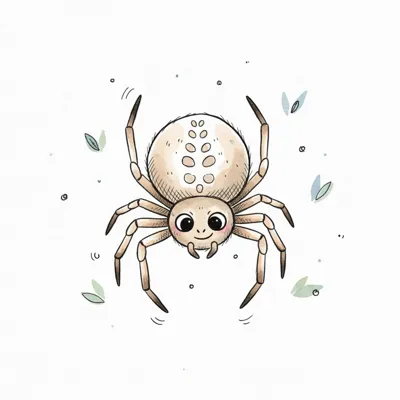 Eine niedliche, cartoonartige Spinne mit großen Augen und zarten Blättern.
