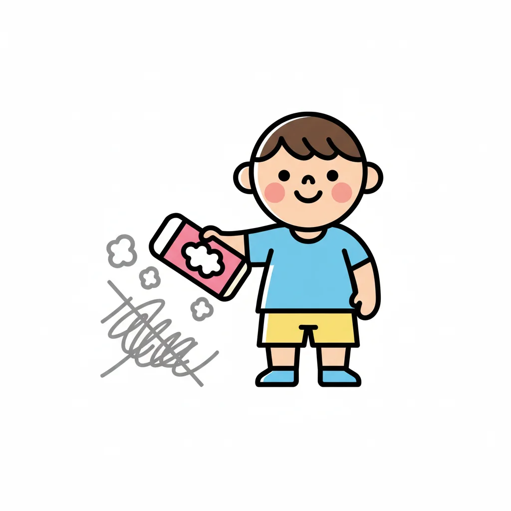 Ein lächelnder Junge radiert Kritzeleien mit einem Radiergummi weg.