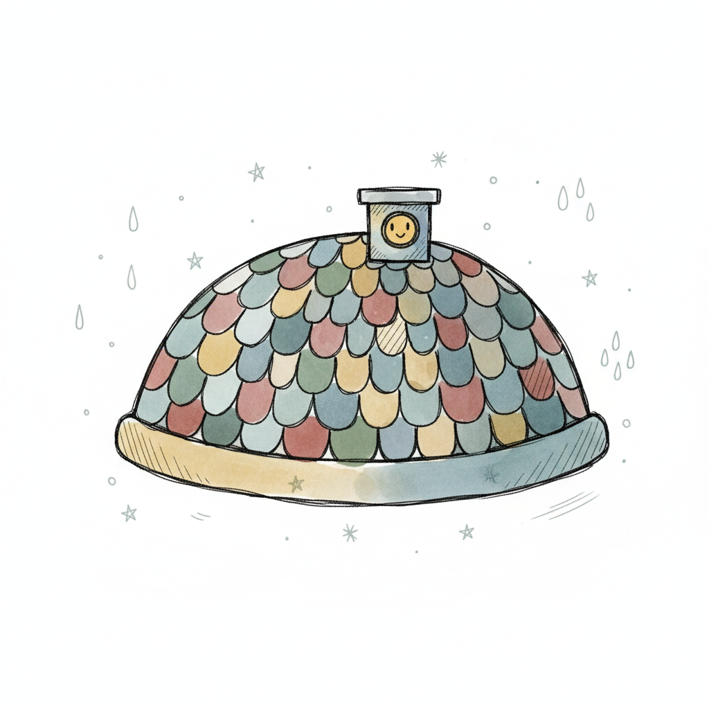 Illustration eines bunten Kuppeldachs mit Schuppen, einem lächelnden Schornstein und Wettersymbolen.