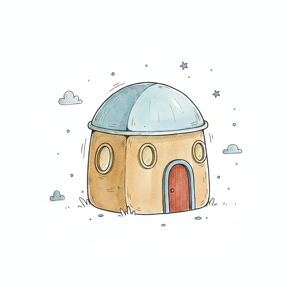 Niedliches, cartoonartiges Haus mit Kuppeldach, umgeben von Sternen und Wolken.