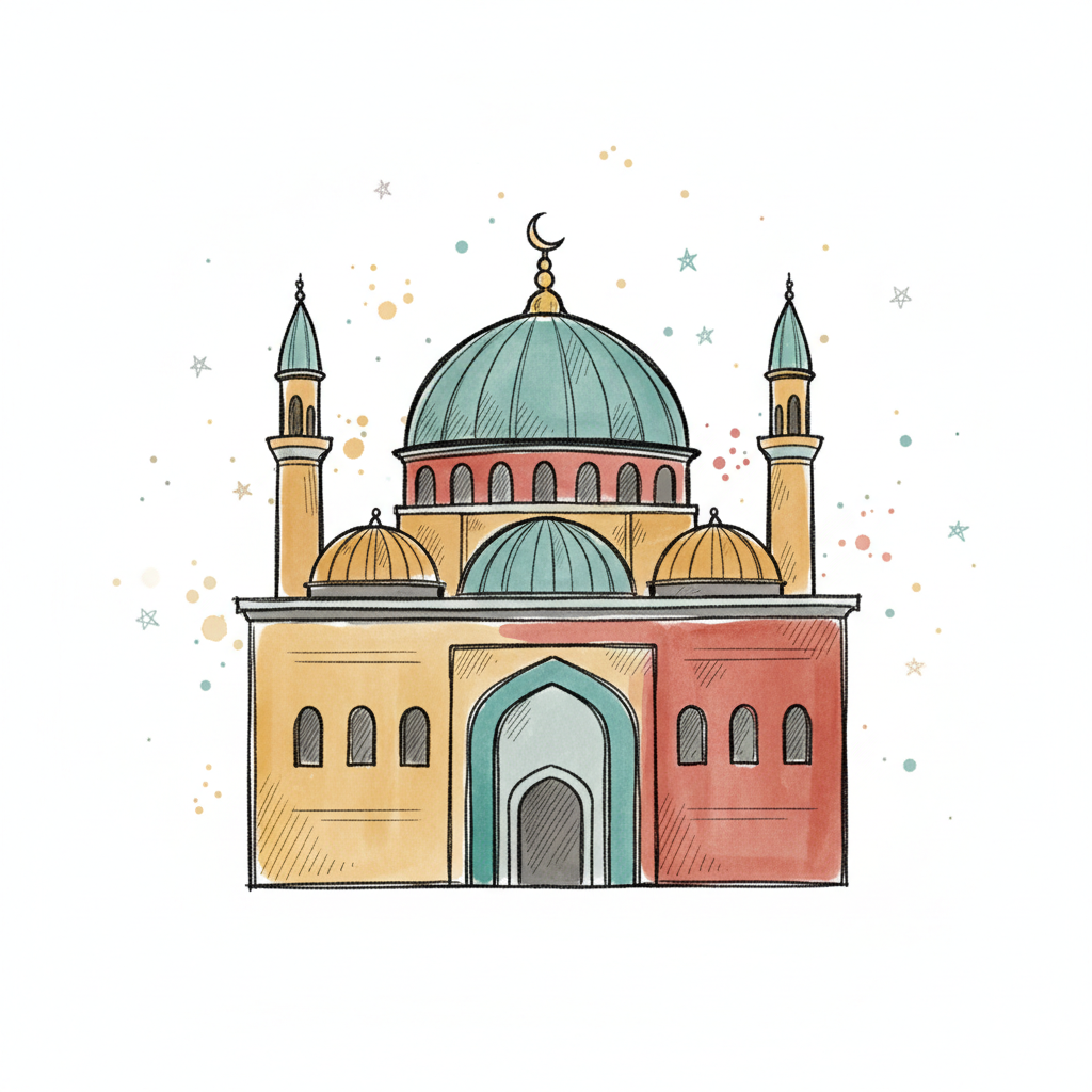 Bunt illustrierte Moschee mit Kuppel und Minaretten.