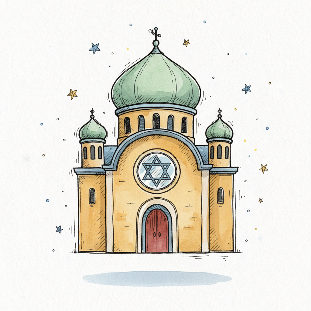 Bunte Zeichnung einer Synagoge mit Kuppeln und Davidstern.