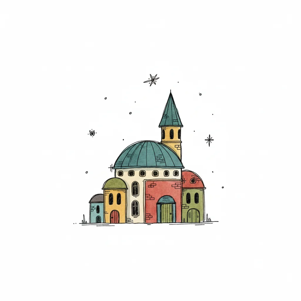 Bunte, handgezeichnete Illustration eines fantasievollen Gebäudes mit Kuppel und Turm, umgeben von Sternen.