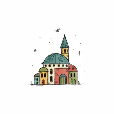 Handgezeichnetes Gebäude mit grüner Kuppel, beigem Hauptteil und einem stilisierten Objekt im Eingang.