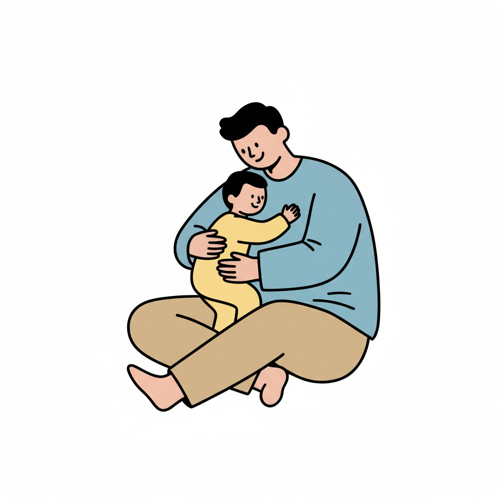 Ein Vater umarmt sein lächelndes Kind in einer liebevollen Pose.