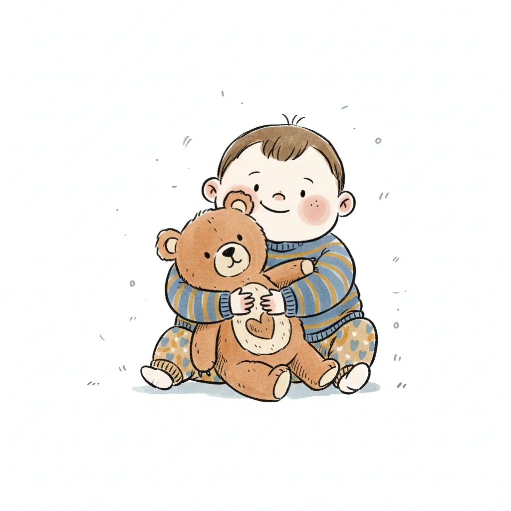 Ein Kleinkind umarmt einen Teddy und strahlt Freude aus.