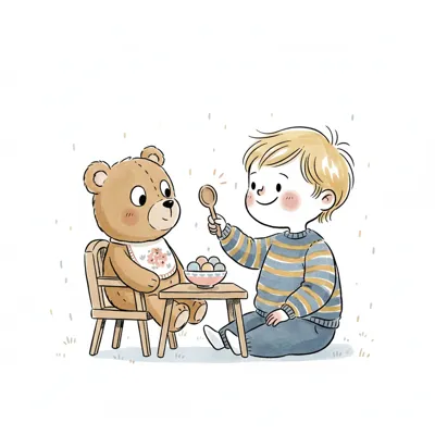 Ein Junge füttert seinen Stoffbär am Tisch mit Löffel und Schüsseln.