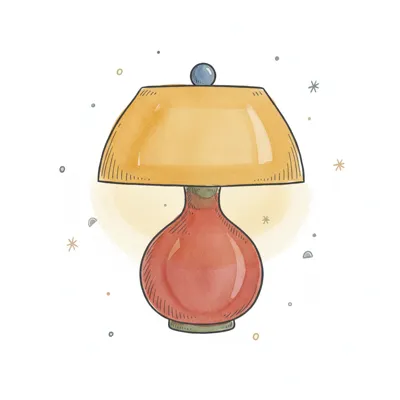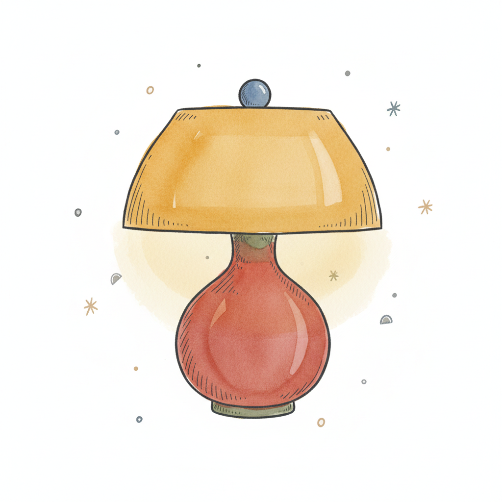 Aquarell-Illustration einer Lampe mit gelbem Schirm und rotem Fuß auf weißem Hintergrund.
