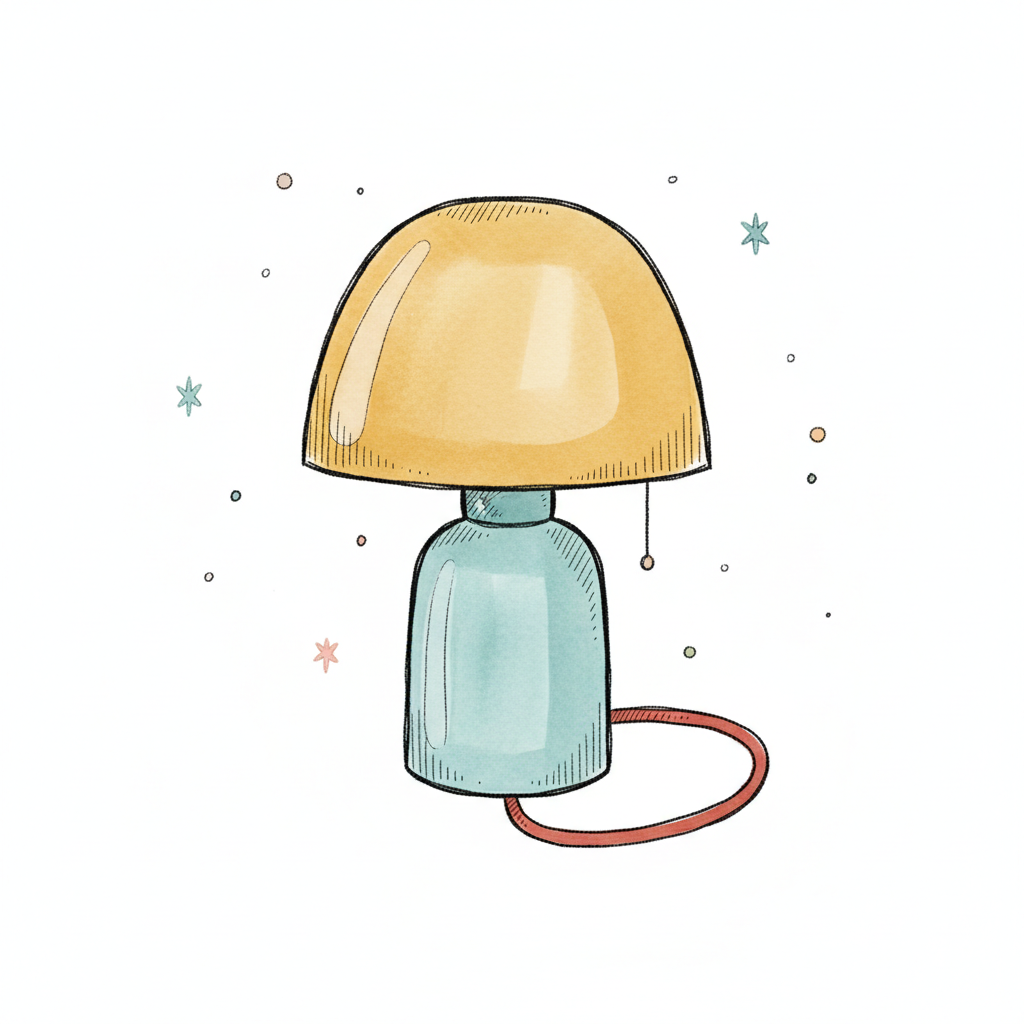 Niedliche Illustration einer Pilzlampe mit gelbem Schirm und blauem Fuß, umgeben von Sternen.