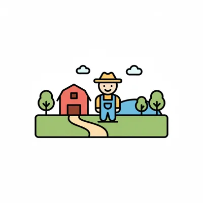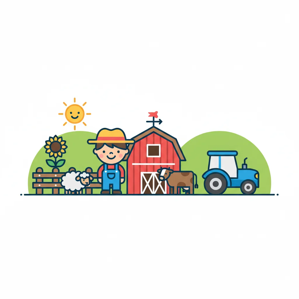Niedliche Bauernhofszene mit Bauer, Tieren, Scheune und Traktor unter lächelnder Sonne.