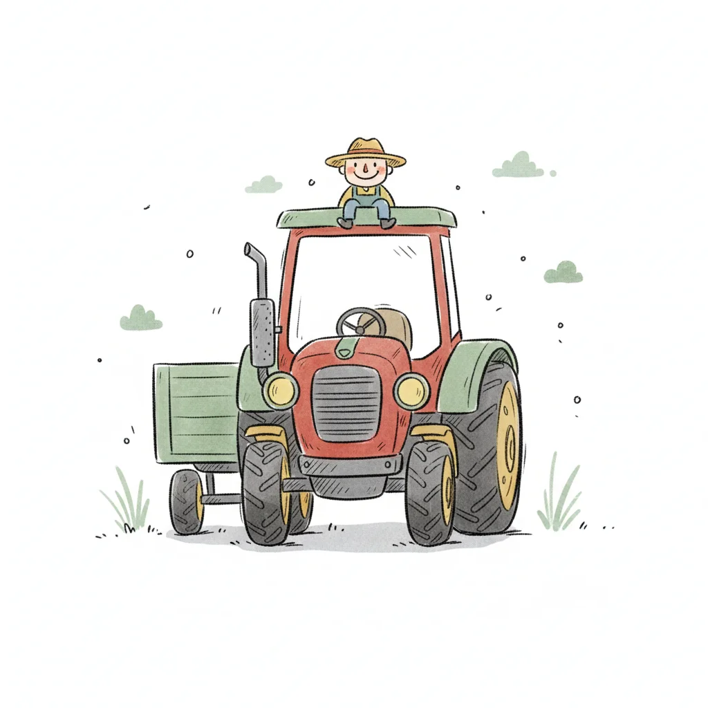 Roter Cartoon-Traktor im Aquarellstil mit großen Rädern, umgeben von kleinen Wolken und Weizenähren.