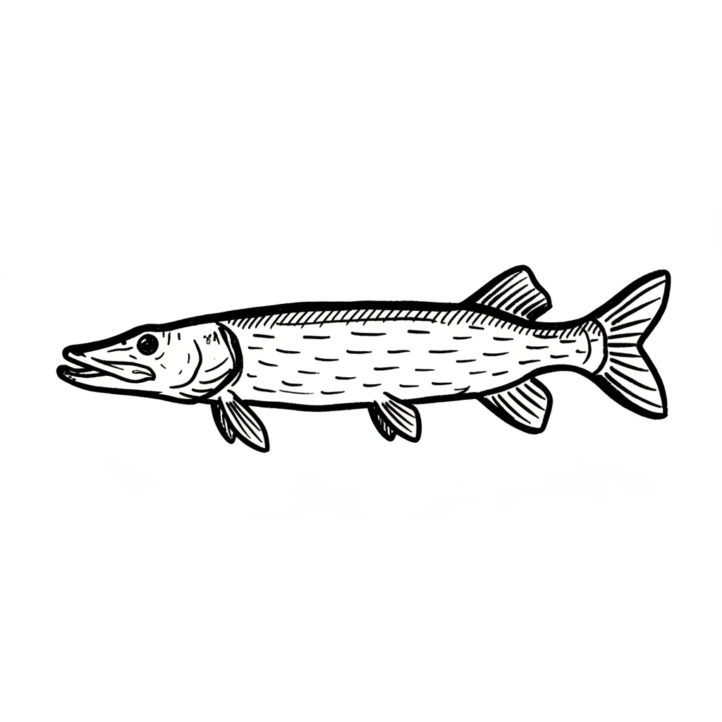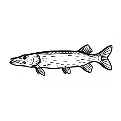 Ein stilisierter Fisch mit länglichem Körper und großer Schnauze.