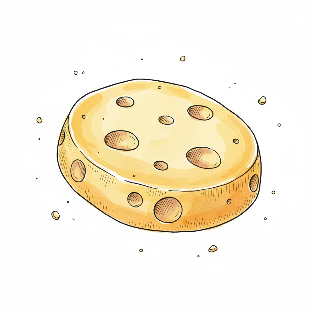 Handgezeichnete, gelbe Käsescheibe mit Löchern, leicht oval und umgeben von kleinen Punkten.