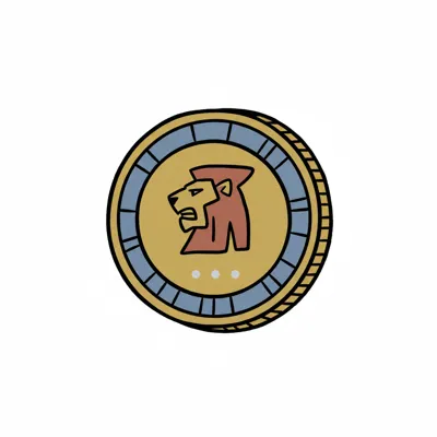 Stilisierte goldene Münze mit Löwenkopf-Profil und blauer Umrandung.