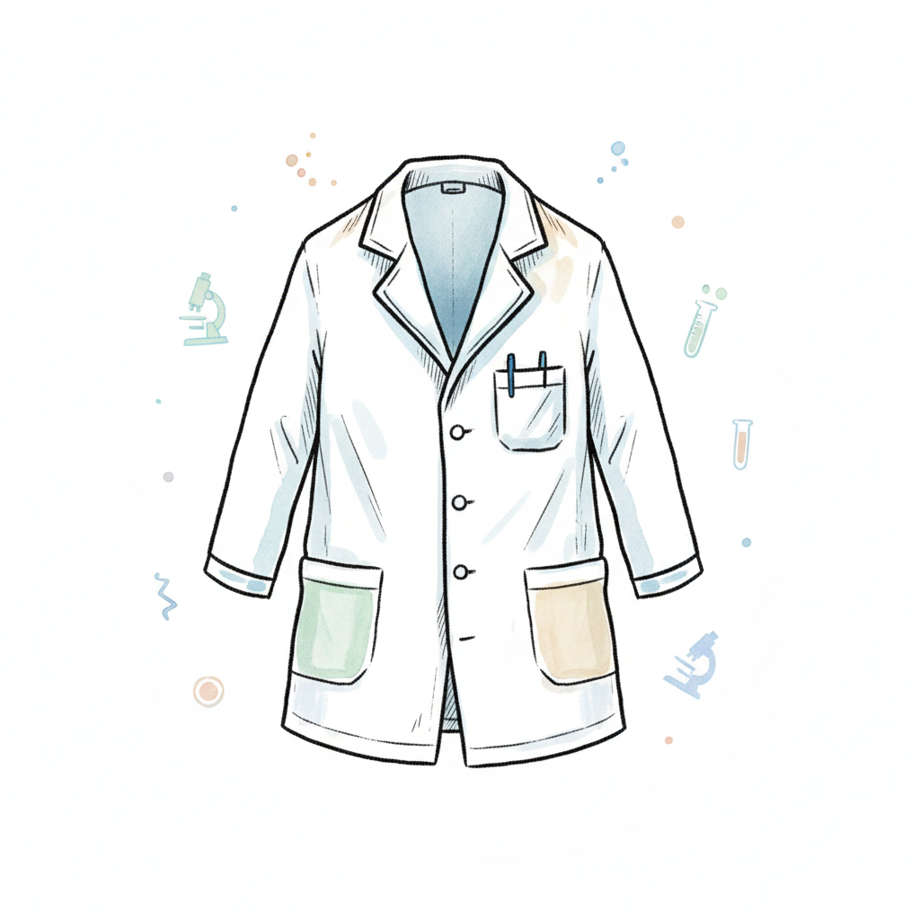 Ein illustrierter weißer Laborkittel mit Stift und dezenten Wissenschaftssymbolen im Hintergrund.