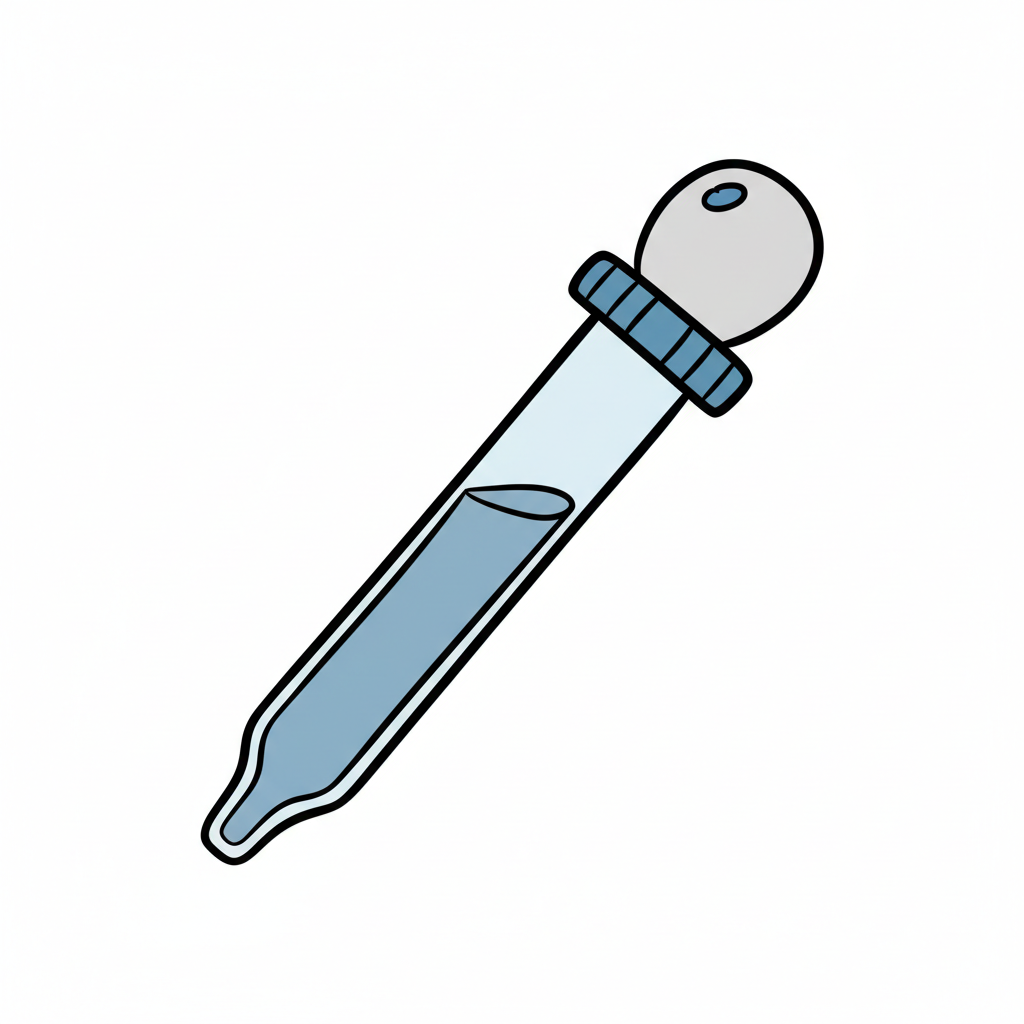 Eine gezeichnete Pipette mit blauer Flüssigkeit und grauem Gummiball auf weißem Hintergrund.