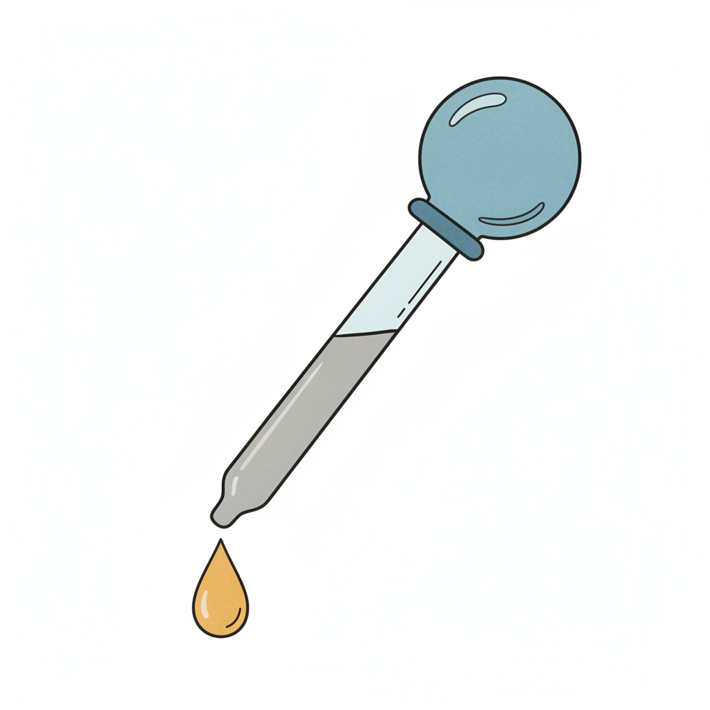 Illustration einer Pipette mit blauem Gummiball, aus der ein gelber Tropfen fällt.