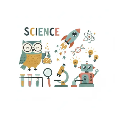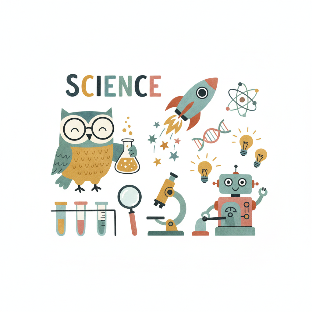 Buntes Cartoon-Bild mit Eule, Roboter, Rakete und Laborgeräten zum Thema Wissenschaft.