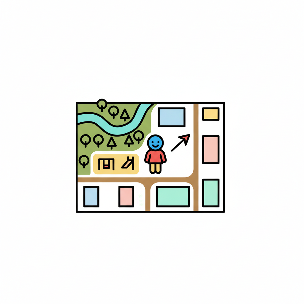 Bunte Karte mit einer Person, die sich in einer Stadt mit Park, Fluss und Gebäuden orientiert.