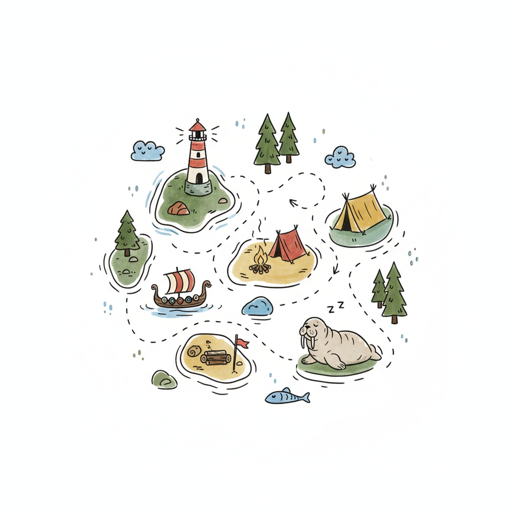 Verspielte Karte mit Inseln, Leuchtturm, Wikingerschiff, Zelten, Lagerfeuer und Walross.